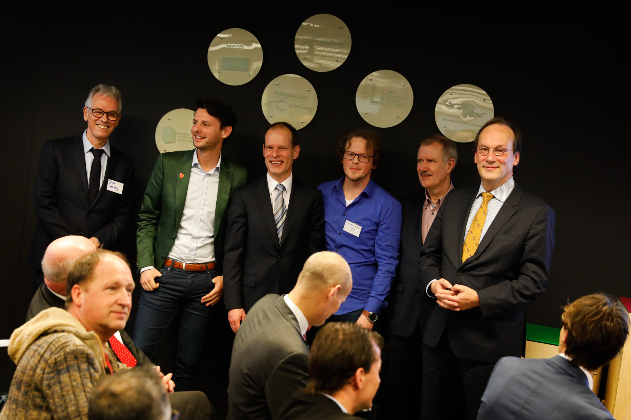 Van links naar rechts: Jaap Verweij, Vicevoorzitter RvB en decaan Erasmus Mc, Martin Luxemburg, directeur Erasmus Centre for Entrepreneurship, Thijs Spigt, directeur Technology Transfer Office Erasmus MC, Berry Kriesels, voorzitter Life Sciences & health Consortium Rotterdam en ondernemer, Herman Houthoff, hoofd economie gemeente Rotterdam en Huib Pols, rector magnificus van de EUR.